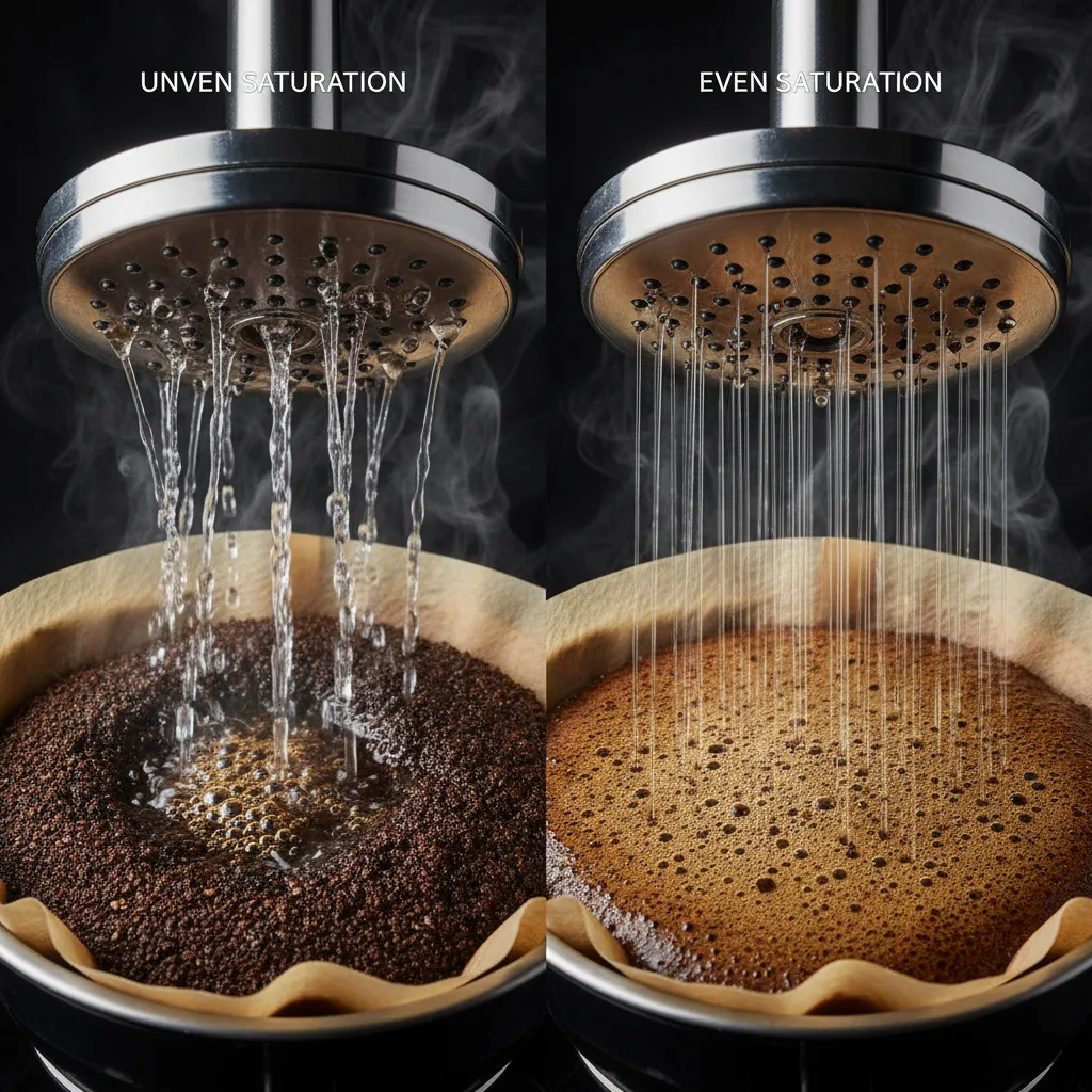 Most cheap machines shoot water through one sad little hole. That creates channeling (uneven brewing), leaving half your grounds untouched and the other half overcooked.