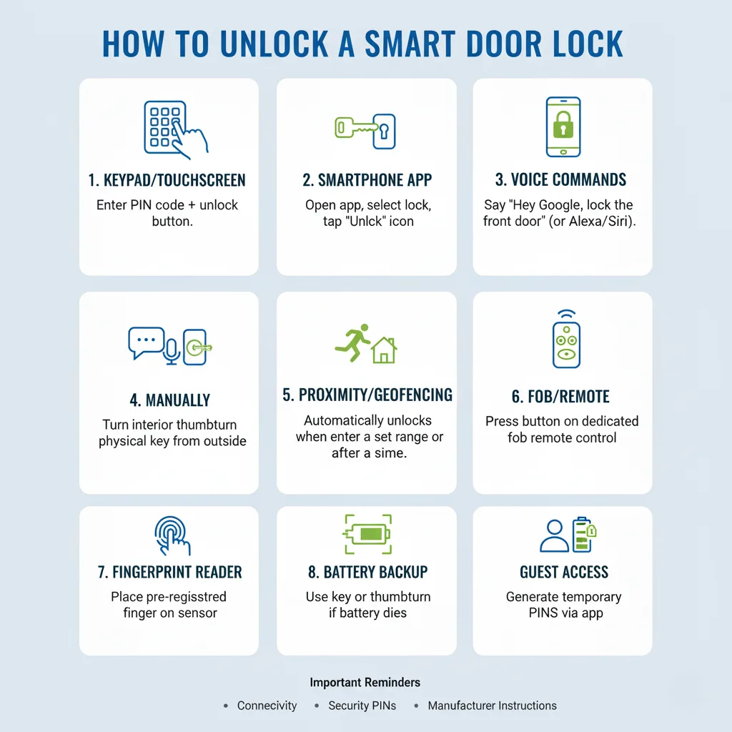 If your lock is integrated with Alexa, Google Assistant, or Siri, you might say, “Alexa, unlock front door.” Many systems require a PIN or secondary confirmation to avoid accidental unlocks.