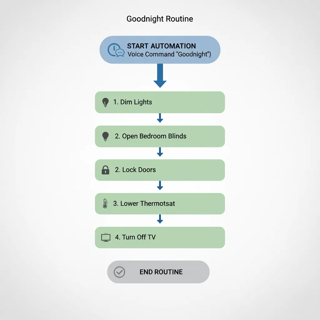 In Apple HomeKit, you’d create a “Goodnight” scene tied to a routine. In SmartThings, you’d set a trigger (say 10:30 PM or the phrase “Goodnight”) with actions for lights, locks, thermostat, and TV.
