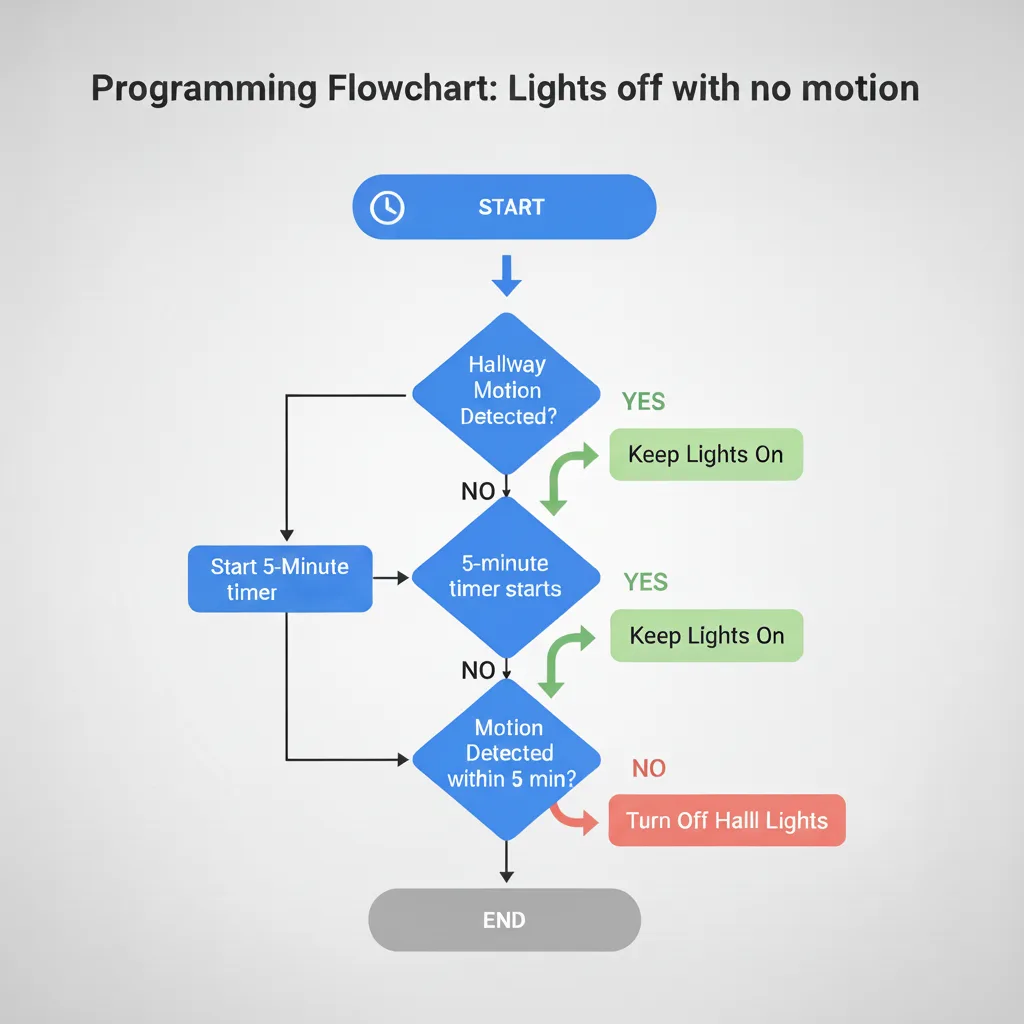 • Device-based: A motion sensor notices movement; hallway lights switch on.