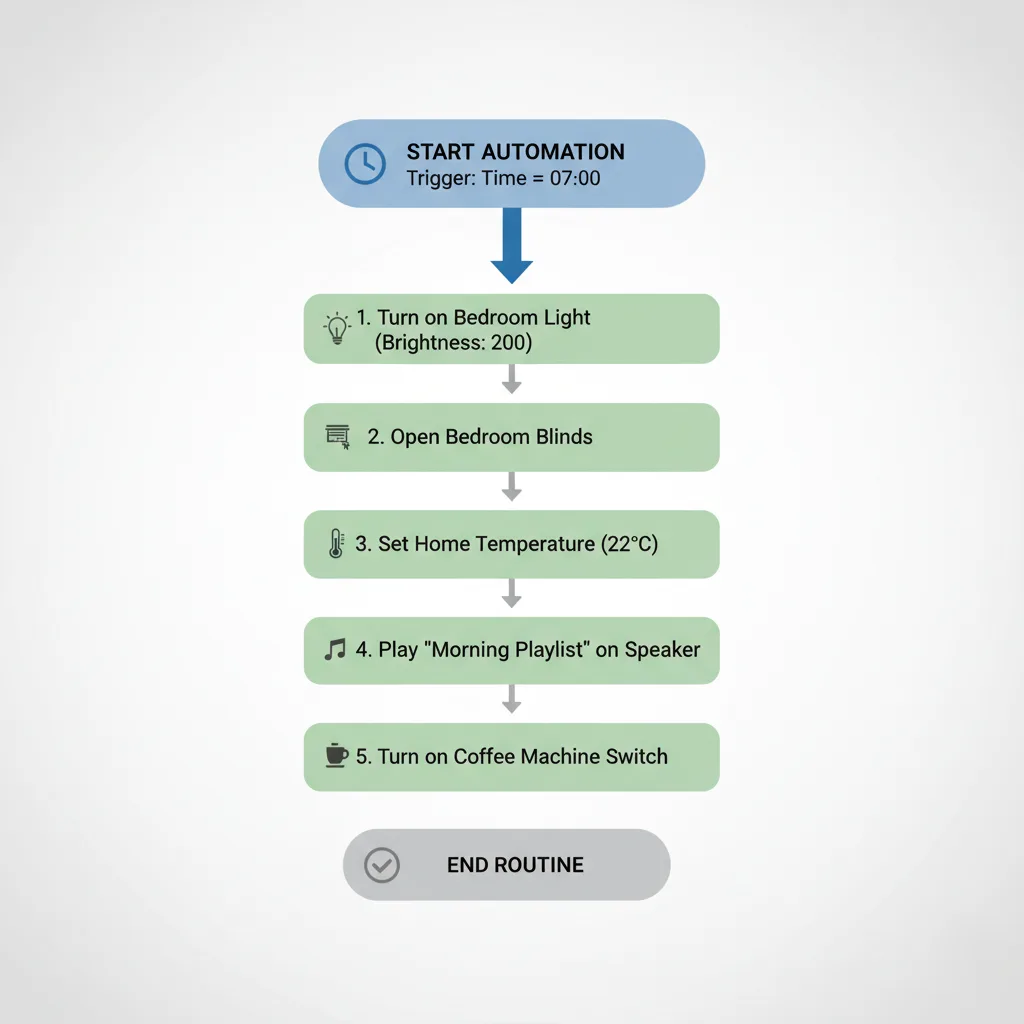At 7:00 AM, bedroom lights slowly brighten. Blinds rise to let in daylight. The thermostat nudges warmer. Your speaker plays a morning playlist. Coffee brews in the kitchen.